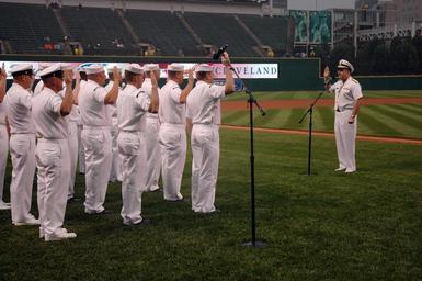 Keywords: US Navy 060828-N-1805P-014 Chief of Naval Personnel Vice Adm. John C. Harvey Jr. administers the oath of office while reenlisting 15 members of Navy Operational Support Center (NOSC) Cleveland.jpg en Cleveland Ohio Aug 28 2006 - Chief of Naval Personnel Vice Adm John C Harvey Jr administers the oath of office while reenlisting 15 members of Navy Operational Support Center NOSC Cleveland on the field before the Major League Baseball game between the Cleveland Indians and Toronto Blue Jays Harvey was in town for Cleveland Navy Week Twenty-six such weeks are planned this year in cities throughout the U S arranged by the Navy Office of Community Outreach NAVCO The mission of NAVCO is to enhance the Navy's brand image in areas with limited exposure to the Navy U S Navy photo by Mass Communication Specialist 1st Class Jason J Perry RELEASED 2006-08-28 060828-N-1805P-014 Navy http //www navy mil/view_image asp id 38626 U S Navy photo by Mass Communication Specialist 1st Class Jason J Perry PD-USGov-Military-Navy Swearing-in military Raised hands during oaths Progressive Field Reenlistment John C Harvey Jr Images from US Navy location Cleveland Ohio Cleveland Navy Week