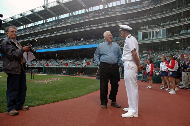 Keywords: US Navy 060830-N-1805P-003 Amphibious transport dock ship USS Cleveland (LPD 7) Commanding Officer, Capt. Frank McCulloch and Major League Baseball Hall of Fame Inductee and World War II Navy veteran Bob Feller swap sea stories.jpg en Cleveland Ohio Aug 30 2006 - Amphibious transport dock ship USS Cleveland LPD 7 Commanding Officer Capt Frank McCulloch and Major League Baseball Hall of Fame Inductee and World War II Navy veteran Bob Feller swap sea stories at Jacobs Field before the start of the Major League Baseball game between the Indians vs Toronto Blue Jays Cleveland Sailors are in their ship's namesake town for Cleveland Navy Week festivities Twenty-six such Navy Weeks are planned this year in cities throughout the U S arranged by the Navy Office of Community Outreach NAVCO The mission of NAVCO is to enhance the Navy's brand image in areas with limited exposure to the Navy U S Navy photo by Mass Communication Specialist 1st Class Jason J Perry RELEASED 2006-08-30 060830-N-1805P-003 Navy http //www navy mil/view_image asp id 38685 U S Navy photo by Mass Communication Specialist 1st Class Jason J Perry PD-USGov-Military-Navy USS Cleveland LPD-7 Bob Feller Progressive Field Images from US Navy location Cleveland Ohio Cleveland Navy Week