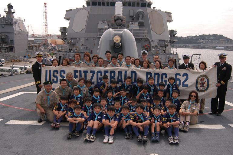 | Keywords: US Navy 061015-N-5334H-179 USS Fitzgerald (DDG 62) Commanding Officer, Cmdr. David Hughes and Executive Officer, Lt. Cmdr. John Tolg hold up the ship's banner with children and adults from the Cub Scouts Tokyo Group.jpg en Yokosuka Japan Oct 15 2006 - USS Fitzgerald DDG 62 Commanding Officer Cmdr David Hughes and Executive Officer Lt Cmdr John Tolg hold up the ship s banner with children and adults from the Cub Scouts Tokyo Group 4 who were given a guided tour of ship More than 50 Cub Scouts and adults enjoyed a tour of the officer s wardroom the ship s bridge and the combat information center U S Navy photo by Mass Communication Specialist 3rd Class David J Hewitt RELEASED 2006-10-15 061015-N-5334H-179 Navy http //www navy mil/view_image asp id 40004 U S Navy photo by Mass Communication Specialist 3rd Class David J Hewitt PD-USGov-Military-Navy United States Fleet Activities Yokosuka Aboard USS Fitzgerald DDG-62 Cub Scouts Naval gun turrets Scouting in Japan |