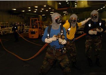| Keywords: US Navy 061104-N-9723W-019 Hose team members move in to fight a simulated hangar bay fire during a general quarters drill.jpg en Pacific Ocean Nov 4 2006 - Hose team members move in to fight a simulated hangar bay fire during a general quarters drill on board nuclear-powered aircraft carrier USS John C Stennis CVN 74 Stennis is currently participating in Joint Task Force Exercise JTFEX off the coast of Southern California JTFEX is the third at-sea phase of John C Stennis Strike Group's pre-deployment training cycle U S Navy photo by Airman Alan Willis RELEASED 2006-11-04 061104-N-9723W-019 Navy http //www navy mil/view_image asp id 40623 U S Navy photo PD-USGov-Military-Navy Aboard USS John C Stennis CVN-74 Anti-flash gear |