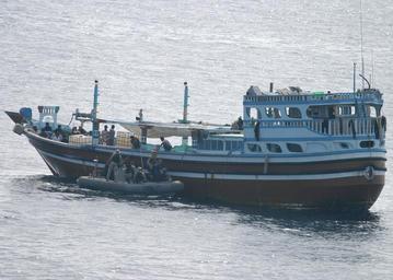 | Keywords: US Navy 061110-N-6397K-007 esponding to a distress call, Sailors assigned to a rescue and assistance team from the U.S. Navy guided-missile cruiser USS Anzio (CG 68), provide aid to the motor vessel SINAA, a 35-meter Iranian-fl.jpg en Arabian Sea Nov 10 2006 Responding to a distress call Sailors assigned to a rescue and assistance team from the U S Navy guided-missile cruiser USS Anzio CG 68 provide aid to the motor vessel SINAA a 35-meter Iranian-flagged dhow Anzio supplied the dhow with water fuel and food to sustain her crew of 24 for their transit home Anzio is deployed as part of the Eisenhower Carrier Strike Group IKE CSG supporting Maritime Security Operations MSO in the 5th Fleet area of operations MSO seek to preserve the free and secure use of the world's oceans by legitimate mariners and prevent terrorist from attempting to use the maritime environment as a venue for attack or as a medium to transport personnel weapons or other material that could support their efforts U S Navy photo by Ensign Patrick King RELEASED 2006-11-10 061110-N-6397K-007 Navy http //www navy mil/view_image asp id 40681 U S Navy photo by Ensign Patrick King PD-USGov-Military-Navy Aboard USS Anzio CG-68 Sinaa ship Wooden vessels in Arabian Sea |