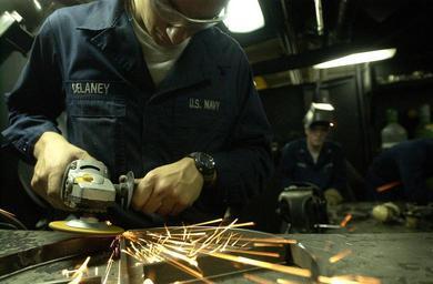 | Keywords: US Navy 061110-N-7130B-181 Hull Maintenance Technician Fireman Sam Delaney from Wellington, Colo., uses a grinder to smooth the weld on a freshly fabricated support stand in the weld booth on board USS Ronald Reagan (CVN 76).jpg en Pacific Ocean Nov 10 2006 - Hull Maintenance Technician Fireman Sam Delaney from Wellington Colo uses a grinder to smooth the weld on a freshly fabricated support stand in the weld booth on board USS Ronald Reagan CVN 76 Reagan's weld booth provides the ship and the entire battle group with maintenance repair and fabrication The Nimitz-class nuclear powered aircraft carrier is currently underway conducting routine carrier operations off the coast of Southern California U S Navy photo by Mass Communication Specialist 2nd Class Aaron Burden RELEASED 2006-11-10 061110-N-7130B-181 Navy http //www navy mil/view_image asp id 40714 U S Navy photo by Mass Communication Specialist 2nd Class Aaron Burden PD-USGov-Military-Navy Maintenance on USS Ronald Reagan CVN-76 Hull Maintenance Technician United States Navy |