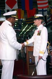 | Keywords: US Navy 061120-N-6270R-001 Commander, Expeditionary Strike Group Seven (ESG-7) Rear Adm. Victor G. Gullory shakes the hand of incoming commander Rear Adm. Carol M. Pottenger, at a change-of-command ceremony.jpg en Okinawa Japan Nov 20 2006 - Commander Expeditionary Strike Group Seven ESG-7 Rear Adm Victor G Gullory shakes the hand of incoming commander Rear Adm Carol M Pottenger at a change-of-command ceremony As the new ESG-7 commander Pottenger becomes the first female to command a forward-deployed operational command and plans to continue to build crucial relationships among countries in Southeast Asia as her predecessor did U S Navy photo by Mass Communication Specialist 1st Class Mark A Rankin RELEASED 2006-11-20 061120-N-6270R-001 Navy http //www navy mil/view_image asp id 41123 U S Navy photo by Mass Communication Specialist 1st Class Mark A Rankin PD-USGov-Military-Navy Images from US Navy location Okinawa Japan Change of command Carol M Pottenger Handshakes involving the military |