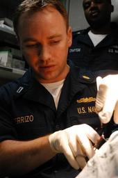 | Keywords: US Navy 070315-N-7945K-090 Lt. Nathan Perrizo, a medical officer attached assigned to USS Nassau (LHA 4) stitches a head wound.jpg en ATLANTIC OCEAN March 15 2007 - Lt Nathan Perrizo a medical officer attached assigned to USS Nassau LHA 4 stitches a head wound Nassau is currently underway conducting training operations for Unit Level Training Assessment Engineering ULTRA E inspections U S Navy photo by Mass Communication Specialist 2nd Class Andrew King RELEASED 2007-03-15 070315-N-7945K-090 Navy http //www navy mil/view_image asp id 44077 U S Navy photo by Mass Communication Specialist 2nd Class Andrew King PD-USGov-Military-Navy Aboard USS Nassau LHA-4 |