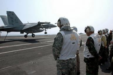 | Keywords: US Navy 070328-N-1635S-002 Commander United Nations Command, Combined Forces Command United States Forces Korea, Gen. B.B. Bell, left, watches the landing of an F-A-18E Super Hornet with a group of distinguished visitors (DV).jpg en SOUTH CHINA SEA March 28 2007 - Commander United Nations Command Combined Forces Command United States Forces Korea Gen B B Bell left watches the landing of an F/A-18E Super Hornet with a group of distinguished visitors DV and Republic of Korea nationals aboard USS Ronald Reagan CVN 76 The visit was scheduled to familiarize the group with aircraft carrier operations and to allow them to see the capabilities of Reagan Ronald Reagan Carrier Strike Group is underway in support of operations in the western Pacific U S Navy photo by Mass Communication Specialist 3rd Class Joshua Scott RELEASED 2007-03-28 070328-N-1635S-002 Navy http //www navy mil/view_image asp id 44503 U S Navy photo by Mass Communication Specialist 3rd Class Joshua Scott PD-USGov-Military-Navy F/A-18 Hornet landings on USS Ronald Reagan CVN-76 Guests aboard USS Ronald Reagan CVN-76 |