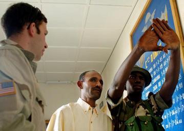 | Keywords: US Navy 070402-N-6901L-107 A U.S. Army soldier attached to the 1-10 Special Forces Group administers an eye exam with the help of a translator on a Nigerian soldier during the opening day of Operation Flintlock 2007.jpg en MARADI Niger April 2 2007 - A U S Army soldier attached to the 1-10 Special Forces Group administers an eye exam with the help of a translator on a Nigerian soldier during the opening day of Operation Flintlock 2007 The primary focus of Operation Flintlock is to provide an interactive exchange of military linguistic and intercultural skills for both nations This event is part of an ongoing and long standing military-to-military relationship that the U S enjoys with Niger and part of the U S State Department's Trans-Sahara Counterterrorism Partnership TSCTP U S Navy photo by Mass Communication Specialist 1st Class Michael Larson RELEASED 2007-04-02 070402-N-6901L-107 Navy http //www navy mil/view_image asp id 44773 U S Navy photo by Mass Communication Specialist 1st Class Michael Larson PD-USGov-Military-Navy Images from US Navy location MARADI Niger Flintlock 2007 |