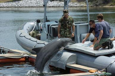 MAKE A MEME View Large Image Navy 070613-N-7676W-331 Aviation Structural Mechanic 2nd Class Shaun McDonald, center, assigned to Naval Special Clearance Team One (NSCT) 1, brings Ten, a Marine Mammal System (MMS) dolphin, aboard a rigid hull inflatable b.jpg en PANAMA ...