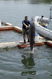 Keywords: US Navy 070613-N-7676W-177 Aviation Structural Mechanic 2nd Class Shaun McDonald, assigned to Naval Special Clearance Team One (NSCT-1), works with Ten, a Marine Mammal System (MMS) dolphin.jpg en PANAMA CITY Fla June 13 2007 - Aviation Structural Mechanic 2nd Class Shaun McDonald assigned to Naval Special Clearance Team One NSCT-1 works with Ten a Marine Mammal System MMS dolphin during a demonstration as part of Autonomous Underwater Vehicle AUV Fest 2007 Sponsored by the Office of Naval Research ONR AUV Fest is the largest in-water demonstration of unmanned underwater surface air and ground vehicles ever conducted U S Navy photograph by Mr John F Williams RELEASED 2007-06-13 070613-N-7676W-177 Navy http //www navy mil/view_image asp id 47144 U S Navy photo PD-USGov-Military-Navy Images from US Navy location PANAMA CITY Fla Aviation Structural Mechanic United States Navy Marine Mammal Program People with sea mammals Tursiops truncatus captive United States Naval Special Clearance Team One