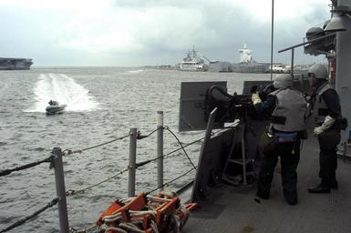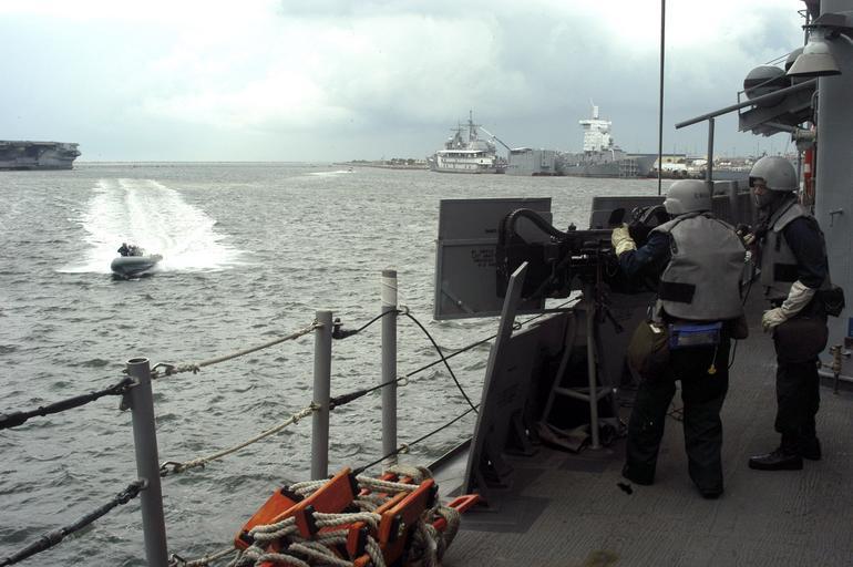| Keywords: US Navy 070613-N-4049C-020 Sailors from guided-missile destroyer USS Vicksburg (CG 69) man the small craft action team (SCAT) during a small boat attack drill on Naval Station Mayport.jpg en MAYPORT Fla June 13 2007 - Sailors from guided-missile destroyer USS Vicksburg CG 69 man the small craft action team SCAT during a small boat attack drill on Naval Station Mayport The drill was filmed by the Center for Security Forces for an anti-terrorism force protection training video to be shown to commanding officers U S Navy photo by Mass Communication Specialist Seaman Patrick J Cook RELEASED 2007-06-13 070613-N-4049C-020 Navy http //www navy mil/view_image asp id 47152 U S Navy photo by Mass Communication Specialist Seaman Patrick J Cook PD-USGov-Military-Navy Naval Station Mayport USS Vicksburg CG-69 Military people on duty |