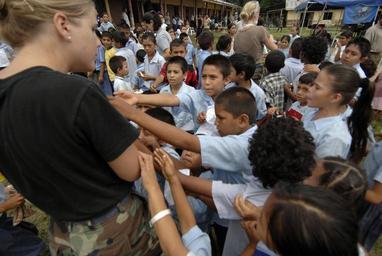| Keywords: US Navy 070622-N-6278K-004 Air National Guardsman Staff Sgt. Sarah Boyll hands out toys to children at Monsignor Romero Roman Catholic School.jpg en VALLEY OF PEACE Belize June 22 2007 - Air National Guardsman Staff Sgt Sarah Boyll hands out toys to children at Monsignor Romero Roman Catholic School in the Valley of Peace Belize Boyll is attached to the Military Sealift Command MSC hospital ship USNS Comfort T-AH 20 Comfort is on a four-month humanitarian deployment to Latin America and the Caribbean region providing medical treatment to approximately 85 000 patients in a dozen countries While deployed Comfort is under operational control of U S Naval Forces Southern Command and tactical control of Destroyer Squadron 24 U S Navy photo by Mass Communication Specialist 2nd Class Joan E Kretschmer RELEASED 2007-06-22 070622-N-6278K-004 Navy http //www navy mil/view_image asp id 47579 U S Navy photo by Mass Communication Specialist 2nd Class Joan E Kretschmer PD-USGov-Military-Navy United States Navy in Valley of Peace Belize Aboard USNS Comfort T-AH-20 Roman Catholic schools |