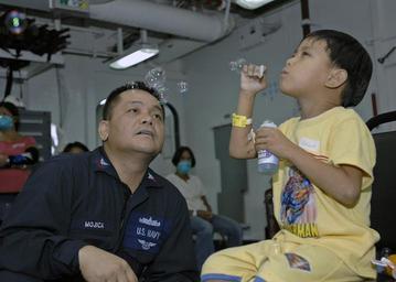 | Keywords: US Navy 070630-N-4954I-067 Machinist's Mate 2nd Class Astor Mojica attached to the amphibious assault ship USS Peleliu (LHA 5), watches a Filipino child blow bubbles in the medical ward as he waits for surgery.jpg en PHILIPPINE SEA June 30 2007 - Machinist's Mate 2nd Class Astor Mojica attached to the amphibious assault ship USS Peleliu LHA 5 watches a Filipino child blow bubbles in the medical ward as he waits for surgery Mojica volunteers in medical as a translator to assist in putting the patients at ease The child was flown to the ship in support of Pacific Partnership 2007 The Pacific Partnership medical team provides general and ophthalmology surgery basic medical evaluation and treatment preventive medicine treatment dental screenings and treatment optometry screenings eyewear distribution public health training and veterinary services as requested by the government of the Philippines U S Navy photo by Mass Communication Specialist 3rd Class Bryan M Ilyankoff RELEASED 2007-06-30 070630-N-4954I-067 Navy http //www navy mil/view_image asp id 47779 U S Navy photo by Mass Communication Specialist 3rd Class Bryan M Ilyankoff PD-USGov-Military-Navy Blowing soap bubbles Aboard USS Peleliu LHA-5 |