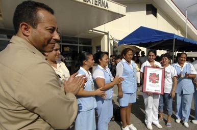| Keywords: US Navy 070630-N-0194K-151 Lt. Cmdr. Manny Santiago, medical site leader for Military Sealift Command hospital ship USNS Comfort (T-AH 20), claps with outpatient nurses at Puerto Barrios National Hospital.jpg en PUERTO BARRIOS Guatemala June 30 2007 - Lt Cmdr Manny Santiago medical site leader for Military Sealift Command hospital ship USNS Comfort T-AH 20 claps with outpatient nurses at Puerto Barrios National Hospital shortly after presenting a framed Comfort print as a gift of appreciation to the Guatemalan community Comfort is on a four-month humanitarian deployment to Latin America and the Caribbean to provide medical treatment to patients in a dozen countries While deployed Comfort is under operational control of U S Naval Forces Southern Command and tactical control of Destroyer Squadron 24 U S Navy photo by Mass Communication Specialist 2nd Class Steven King RELEASED 2007-06-30 070630-N-0194K-151 Navy http //www navy mil/view_image asp id 47822 U S Navy photo by Mass Communication Specialist 2nd Class Steven King PD-USGov-Military-Navy US Navy in Puerto Barrios Aboard USNS Comfort T-AH-20 |