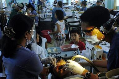 | Keywords: US Navy 070716-N-9195K-052 Kenny Kwon, a volunteer from the University of California at San Diego^rsquo,s Pre-Dental Society, assists Dr. Hoang Thu Ha, a dentist with the East Meets West Foundation, as he places sealant on a lo.jpg en DA NANG Vietnam July 16 2007 Kenny Kwon a volunteer from the University of California at San Diego s Pre-Dental Society assists Dr Hoang Thu Ha a dentist with the East Meets West Foundation as he places sealant on a local child s tooth during a dental civic action program conducted in support of Pacific Partnership 2007 The medical dental and engineering support programs with the cooperation of the Da Nang Ministry of Health assist the Vietnamese in providing the local community with a wide range of services For this mission the partnership includes the government of Vietnam and regional partners Navy personnel military and civilian preventive medicine teams Air Force Army Uniformed Health Services medical personnel non-governmental organizations and a Navy mobile construction team U S Navy photo by Mass Communication Specialist 3rd Class Patrick M Kearney RELEASED 2007-07-16 070716-N-9195K-052 Navy http //www navy mil/view_image asp id 48304 U S Navy photo by Mass Communication Specialist 3rd Class Patrick M Kearney PD-USGov-Military-Navy Health in Da Nang People of Da Nang |