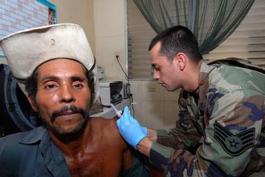 | Keywords: US Navy 070720-N-8704K-103 U.S. Air National Guard Staff Sgt. Christopher Flores, attached to Military Sealift Command hospital ship USNS Comfort (T-AH 20), gives Inhelio Lopez an immunization shot at the 15 de Julio Health Car.jpg en CHINANDEGA Nicaragua July 20 2007 - U S Air National Guard Staff Sgt Christopher Flores attached to Military Sealift Command hospital ship USNS Comfort T-AH 20 gives Inhelio Lopez an immunization shot at the 15 de Julio Health Care Center Comfort is on a four-month humanitarian deployment to Latin America and the Caribbean to provide medical treatment to patients in a dozen countries While deployed Comfort is under the operational control of U S Naval Forces Southern Command and tactical control of Destroyer Squadron 24 U S Navy photo by Mass Communication Specialist 2nd Class Joshua Karsten RELEASED 2007-07-20 070720-N-8704K-103 Navy http //www navy mil/view_image asp id 48540 U S Navy photo by Mass Communication Specialist 2nd Class Joshua Karsten PD-USGov-Military-Navy Images from US Navy location CHINANDEGA Nicaragua Aboard USNS Comfort T-AH-20 |