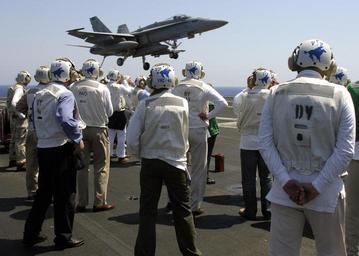 | Keywords: US Navy 070730-N-6524M-002 A group of distinguished visitors, including presidency members of Bosnia-Herzegovina, observe an F-A-18C Hornet descend toward the landing area of nuclear-powered aircraft carrier USS Enterprise (CVN.jpg F/A-18C Hornet descend toward the landing area of nuclear-powered aircraft carrier USS Enterprise CVN 65 Enterprise and embarked Carrier Air Wing CVW 1 are underway on a scheduled deployment in support of the global war on terrorism U S Navy photo by Mass Communication Specialist Seaman Brandon Morris RELEASED 2007-07-30 070730-N-6524M-002 Navy http //www navy mil/view_image asp id 48861 U S Navy photo by Mass Communication Specialist Seaman Brandon Morris PD-USGov-Military-Navy Aboard USS Enterprise CVN-65 F/A-18 Hornet in flight |