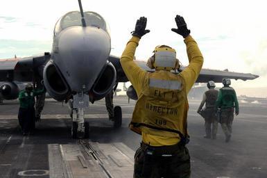 | Keywords: US Navy 070807-N-8119R-070 Aviation Boatswain^rsquo,s Mate (Handling) Airman Anthony Raymond directs an EA-6B Prowler, assigned to the.jpg en PACIFIC OCEAN Aug 7 2007 - Aviation Boatswain s Mate Handling Airman Anthony Raymond directs an EA-6B Prowler assigned to the Black Ravens of Electronic Attack Squadron VAQ 135 onto the catapult prior to launching off the flight deck of the nuclear-powered aircraft carrier USS Nimitz CVN 68 The Nimitz Carrier Strike Group and embarked Carrier Air Wing CVW 11 are deployed in the U S 7th Fleet area of operation participating in Valiant Shield 2007 Valiant Shield the largest joint exercise in recent history includes 30 ships more than 280 aircraft and more than 20 000 service members from the Navy Marines Air Force and Coast Guard U S Navy photo by Mass Communication Specialist 3rd Class Gretchen Roth RELEASED 2007-08-07 070807-N-8119R-070 Navy http //www navy mil/view_image asp id 49238 U S Navy photo by Mass Communication Specialist 3rd Class Gretchen Roth PD-USGov-Military-Navy Grumman EA-6 Prowler aircraft carrier launches Valiant Shield 2007 Aboard USS Nimitz CVN-68 Aviation Boatswain's Mates Handlers Electronic Attack Squadron 135 United States Navy |