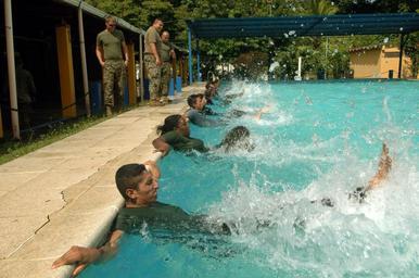 | Keywords: US Navy 070810-N-0989H-119 U.S. Marines assigned to a mobile training team observe Guatemalan sailors and marines conduct a series of aqua aerobics and exercises during Small Unit Tactics training.jpg en PUERTO BARRIOS Guatemala Aug 10 2007 - U S Marines assigned to a mobile training team observe Guatemalan sailors and marines conduct a series of aqua aerobics and exercises during Small Unit Tactics training Task Group 40 9 is deployed under the operational control of U S Naval Forces Southern Command NAVSO for the Global Fleet Station GFS pilot deployment to the Caribbean Basin and Central America The mission is to conduct a broad range of theater security cooperation activities with regional maritime services This deployment is designed to validate the GFS concept for the Navy and support U S Southern Command objectives for its area of responsibility by enhancing cooperative partnerships with regional maritime services and improving operational readiness for the participating partner nations U S Navy photo by Mass Communication Specialist 1st Class David Hoffman RELEASED 2007-08-10 070810-N-0989H-119 Navy http //www navy mil/view_image asp id 49393 U S Navy photo by Mass Communication Specialist 1st Class David Hoffman PD-USGov-Military-Navy US Navy in Puerto Barrios People in swimming pools Swimming pools in Guatemala |