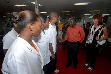 | Keywords: US Navy 071004-N-8704K-031 From right, Ambassador Lisa Bobbie Schreiber Hughes, U.S. ambassador to Suriname, and Michel Felisi, acting Suriname Minister of Health, greet Dutch translators during a tour of hospital ship USNS Com.jpg en ATLANTIC OCEAN Oct 4 2007 - From right Ambassador Lisa Bobbie Schreiber Hughes U S ambassador to Suriname and Michel Felisi acting Suriname Minister of Health greet Dutch translators during a tour of hospital ship USNS Comfort T-AH 20 anchored off the coast of Paramaribo Suriname Comfort is on a four-month humanitarian deployment to Latin America and the Caribbean providing medical treatment to patients in a dozen countries U S Navy photo by Mass Communication Specialist 2nd Class Joshua Karsten RELEASED 2007-10-04 071004-N-8704K-031 Navy http //www navy mil/view_image asp id 51597 U S Navy photo by Mass Communication Specialist 2nd Class Joshua Karsten PD-USGov-Military-Navy Aboard USNS Comfort T-AH-20 Lisa Bobbie Schreiber Hughes |