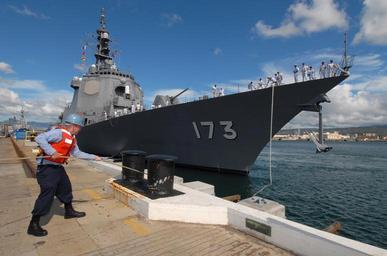 | Keywords: US Navy 071015-N-4965F-004 Operations Specialist Seaman Jerry Carpenter, assigned to USS Lake Erie (CG 70), performs line handlers for Japanese destroyer, JDS Kongo (DDG 173), as she moors at Naval Station Pearl Harbor.jpg en PEARL HARBOR Hawaii Oct 15 2007 - Operations Specialist Seaman Jerry Carpenter assigned to USS Lake Erie CG 70 performs line handlers for Japanese destroyer JDS Kongo DDG 173 as she moors at Naval Station Pearl Harbor Kongo is the first Japanese ship with the capability to detect; track and intercept short to medium range ballistic missiles Later this year Kongo will conduct a flight test designated Japan Flight Test Mission-1 at Pacific Missile Range Facility Hawaii U S Navy photo by Mass Communication Specialist 1st Class James E Foehl RELEASED 2007-10-15 071015-N-4965F-004 Navy http //www navy mil/view_image asp id 51813 U S Navy photo by Mass Communication Specialist 1st Class James E Foehl PD-USGov-Military-Navy Japanese warships at Pearl Harbor JS KongÅ DDG-173 Mooring bollards |