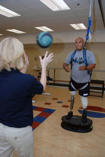 Keywords: US Navy 071015-N-5086M-002 U.S. Army Spc. Saul Martinez trains with the medicine ball while standing on a balancing tool and using the hands-free harness walking gait-training device during a therapy session.jpg en SAN DIEGO Oct 15 2007 U S Army Spc Saul Martinez trains with the medicine ball while standing on a balancing tool and using the hands-free harness walking gait-training device during a therapy session in the new Comprehensive Combat and Complex Casualty Care C5 facility C5 is a program of care that manages severely injured or ill patients from medical evacuation through inpatient care outpatient rehabilitation and their return to active duty or transition from the military The new 30 000-square-foot facility incorporates new technologies that improve prosthetic and rehabilitation services including a 3 500-square-foot multi-terrain obstacle course a 30-foot climbing wall and a technologically advanced training apartment U S Navy photo by Mass Communication Specialist 2nd Class Greg Mitchell RELEASED 2007-10-15 071015-N-5086M-002 Navy http //www navy mil/view_image asp id 51906 U S Navy photo by Mass Communication Specialist 2nd Class Greg Mitchell PD-USGov-Military-Navy Limb prostheses Naval Medical Center San Diego Disabled veterans |