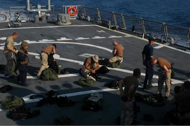 | Keywords: US Navy 071028-N-4014G-002 Members of the visit, board, search, and seizure (VBSS) team aboard guided-missile destroyer USS Porter (DDG 78) prepare their gear in case they must board a pirated vessel.jpg en INDIAN OCEAN Oct 28 2007 - Members of the visit board search and seizure VBSS team aboard guided-missile destroyer USS Porter DDG 78 prepare their gear in case they must board a pirated vessel The ship was responding to a distress call from aboard Panamanian-flagged cargo ship MV Golden Nori The VBSS team is tasked with boarding suspicious ships to inspect them for any illicit activity U S Navy photo by Mass Communication Specialist 3rd Class Patrick Gearhiser RELEASED 2007-10-28 071028-N-4014G-002 Navy http //www navy mil/view_image asp id 52258 U S Navy photo by Mass Communication Specialist 3rd Class Patrick Gearhiser PD-USGov-Military-Navy Aboard USS Porter DDG-78 |