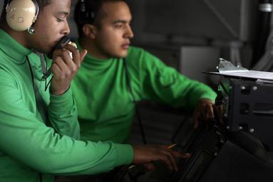 | Keywords: US Navy 071107-N-4776G-209 Aviation Boatswain's Mate (Equipment) 3rd Class Joseph Mustin, from Bristow, Okla., operates a sound powered phone while Interior Communications Electrician 3rd Class Michael Florse, from Los Angeles.jpg en PACIFIC OCEAN Nov 7 2007 - Aviation Boatswain's Mate Equipment 3rd Class Joseph Mustin from Bristow Okla operates a sound powered phone while Interior Communications Electrician 3rd Class Michael Florse from Los Angeles watches the flight deck aboard Nimitz-class aircraft carrier USS Ronald Reagan CVN 76 Ronald Reagan is underway in the Pacific Ocean conducting flight deck certification U S Navy photo by Mass Communication Specialist 3rd Class Kathleen Gorby RELEASED 2007-11-07 071107-N-4776G-209 Navy http //www navy mil/view_image asp id 52556 U S Navy photo by Mass Communication Specialist 3rd Class Kathleen Gorby PD-USGov-Military-Navy Aviation Boatswain's Mates Equipment Aboard USS Ronald Reagan CVN-76 Interior Communications Electrician People of the United States Navy with sound-powered telephones |