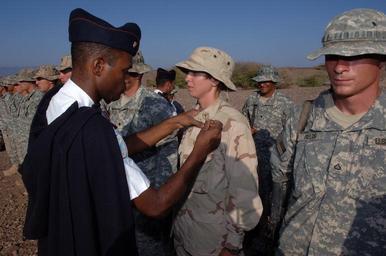 | Keywords: US Navy 071113-N-3931M-030 An instructor from the French military pins a survival badge on U.S. Navy Hospital Corpsman 3rd Class Gwendolyn Collver, assigned to Combined Joint Task Force-Horn of Africa, upon completion of a dese.jpg en SIDA Djibouti Nov 13 2007 An instructor from the French military pins a survival badge on U S Navy Hospital Corpsman 3rd Class Gwendolyn Collver assigned to Combined Joint Task Force-Horn of Africa upon completion of a desert survival course conducted by the French military The training consisted of class instruction on land navigation using global positioning systems cooking and eating to survive how to use camels to transport equipment helicopter medical evacuations how to start a fire and techniques for rigging traps U S Navy photo by Mass Communication Specialist 1st Class Michael R McCormick Released 2007-11-13 071113-N-3931M-030 Navy http //www navy mil/view_image asp id 52892 U S Navy photo by Mass Communication Specialist 1st Class Michael R McCormick PD-USGov-Military-Navy Images from US Navy location SIDA Djibouti Presentation of military decorations |