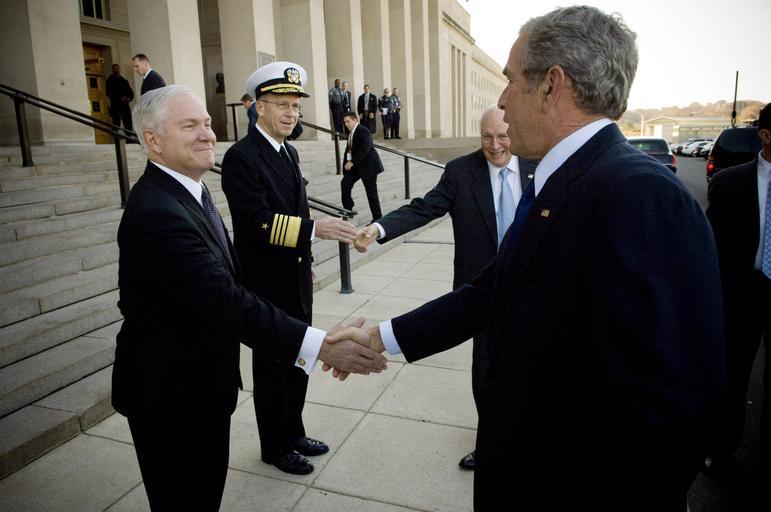 | Keywords: US Navy 071129-N-0696M-094 Secretary of Defense Robert M. Gates and Chairman of Joint Chiefs of Staff, Adm. Mike Mullen greets President George W. Bush and Vice President Dick Cheney on the steps of the Pentagon.jpg en PENTAGON Nov 29 2007 Secretary of Defense Robert M Gates and Chairman of Joint Chiefs of Staff Adm Mike Mullen greets President George W Bush and Vice President Dick Cheney on the steps of the Pentagon The senior leaders held a meeting discussing long-term strategic plans for the military with the Joint Chiefs of Staff Deputy Secretary of Defense Gordon England Defense Dept photo by Mass Communication Specialist 1st Class Chad J McNeeley Released 2007-11-29 071129-N-0696M-094 Navy http //www navy mil/view_image asp id 53263 U S Navy photo PD-USGov-Military-Navy The Pentagon Michael G Mullen in 2007 Robert Gates in 2007 Dick Cheney in 2007 Handshakes involving the military Handshakes involving politicians |