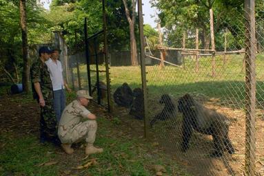 | Keywords: US Navy 071212-N-0193M-416 Felix Lankester, project manager for the Limbe Wildlife Center, introduces U.S. Navy Cmdr. Byron Smith, kneeling, and British Navy Cmdr. Nigel May, to the center's residents while giving a tour.jpg en LIMBE Cameroon Dec 12 2007 Felix Lankester project manager for the Limbe Wildlife Center introduces U S Navy Cmdr Byron Smith kneeling and British Navy Cmdr Nigel May to the center's residents while giving a tour Smith and May visited the center to assess the possibility of Africa Partnership Station APS volunteers visiting in the future for a humanitarian project APS is a multi-national effort to bring the latest training and techniques to maritime professionals in nine West African countries to address common threats of illegal fishing smuggling and human trafficking In addition to maritime training APS will perform more than 20 humanitarian projects in the region U S Navy photo by Mass Communication Specialist 2nd Class Elizabeth Merriam Released 2007-12-12 071212-N-0193M-416 Navy http //www navy mil/view_image asp id 53852 U S Navy photo by Mass Communication Specialist 2nd Class Elizabeth Merriam PD-USGov-Military-Navy Limbe Africa Partnership Station 2007 Limbe Wildlife Centre |