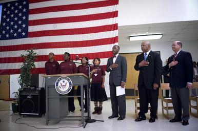 | Keywords: US Navy 080109-N-5549O-066 Secretary of the Navy The Honorable Dr. Donald C. Winter, right, U.S. Rep. Elijah E. Cummings (D-Md.), Maritime Industries Academy Principal Kevin Brooks, and students of the academy sing the national.jpg en BALTIMORE Jan 9 2007 Secretary of the Navy SECNAV The Honorable Dr Donald C Winter right U S Rep Elijah E Cummings D-Md Maritime Industries Academy Principal Kevin Brooks and students of the academy sing the national anthem Secretary Winter and Rep Cummings spoke to approximately 300 students at the academy about career opportunities in the Navy and Marine Corps The academy is designed to prepare students on a job-readiness track for maritime related industry occupations U S Navy photo by Mass Communication Specialist 2nd Class Kevin S O'Brien Released 2007-01-09 080109-N-5549O-066 Navy http //www navy mil/view_image asp id 54378 U S Navy photo by Mass Communication Specialist 2nd Class Kevin S O'Brien PD-USGov-Military-Navy Baltimore Maryland Donald C Winter Elijah Cummings |