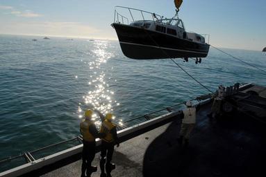 | Keywords: US Navy 080111-N-4009P-459 Boatswain's mates work to crane off the admiral's barge from the hangar bay into the water.jpg en SANTA BARBARA Calif Jan 11 2007 Boatswain's mates work to crane off the admiral's barge from the hangar bay into the water as the crew of the Nimitz-class nuclear-powered aircraft carrier USS Ronald Reagan CVN 76 prepares for a port call Navy photo by Mass Communication Specialist 3rd Class Joe Painter Released 2007-01-11 080111-N-4009P-459 Navy http //www navy mil/view_image asp id 54484 U S Navy photo PD-USGov-Military-Navy Hangar bays of USS Ronald Reagan CVN-76 Santa Barbara California Boat cranes |