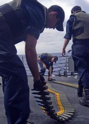 | Keywords: US Navy 080216-N-5253W-001 Sailors aboard the Arleigh Burke-class guided-missile destroyer USS Fitzgerald (DDG 62) in preparation for a live-fire, small-craft action team (SCAT) drill while underway in the western Pacific.jpg en PACIFIC OCEAN Feb 16 2008 Sailors aboard the Arleigh Burke-class guided-missile destroyer USS Fitzgerald DDG 62 lay out belts of 25 mm ammunition for the MK-38 chain gun in preparation for a live-fire small-craft action team SCAT drill while underway in the western Pacific SCAT drills are designed to train crewmembers how to react in the event of a small-boat attack on the ship U S Navy photo by Mass Communication Specialist 3rd Class Gabriel S Weber Released 2008-02-16 080216-N-5253W-001 Navy http //www navy mil/view_image asp id 55413 U S Navy photo by Mass Communication Specialist 3rd Class Gabriel S Weber PD-USGov-Military-Navy People with ammunition belts Aboard USS Fitzgerald DDG-62 25 x 137 mm Taken with Nikon D100 |