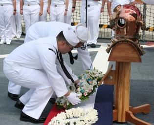 | Keywords: US Navy 080614-N-6775D-079 Sonar Technician 2nd Class Keith Martinez and Ship's Serviceman 2nd Class Harlig Medina, assigned to the guided-missile destroyer USS Stethem (DDG 63), lay a wreath during the memorial ceremony for St.jpg en BUSAN REPUBLIC OF KOREA June 14 2008 Sonar Technician 2nd Class Keith Martinez and Ship's Serviceman 2nd Class Harlig Medina assigned to the guided-missile destroyer USS Stethem DDG 63 lay a wreath during the memorial ceremony for Steelworker 2nd Class Robert D Stethem Stethem the ship's namesake was killed June 14 1985 by hijackers aboard TWA Flight 847 after he was discovered as an American Sailor U S Navy photo by Chieft Intelligence Specialist Marc de St Aubin Released 2008-06-14 080614-N-6775D-079 Navy http //www navy mil/view_image asp id 60384 U S Navy photo by Chieft Intelligence Specialist Marc de St Aubin PD-USGov-Military-Navy Images from US Navy location BUSAN Korea Aboard USS Stethem DDG-63 |