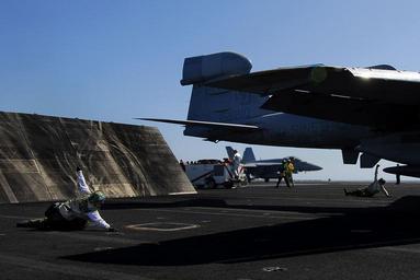 | Keywords: US Navy 080621-N-0684R-051 Final safety checkers give thumbs up before an EA-6B Prowler from the.jpg en PACIFIC OCEAN June 21 2008 Final safety checkers give thumbs up before an EA-6B Prowler from the Vikings of Electronic Attack Squadron VAQ 129 launches from the flight deck of the Nimitz-class aircraft carrier USS John C Stennis CVN 74 Stennis and multiple embarked fleet replacement squadrons are conducting fleet replacement squadron carrier qualifications FRSCQ off the coast of Southern California FRSCQ's are conducted to qualify naval aviators in day and night carrier operations for the first time in the aircraft they will fly during their aviation career U S Navy photo by Mass Communication Specialist 2nd Class Ron Reeves Released 2008-06-21 080621-N-0684R-051 Navy http //www navy mil/view_image asp id 60538 U S Navy photo by Mass Communication Specialist 2nd Class Ron Reeves PD-USGov-Military-Navy Grumman EA-6 Prowler aircraft carrier launches Military people with thumbs up Aboard USS John C Stennis CVN-74 Electronic Attack Squadron 129 United States Navy |