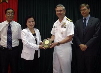 | Keywords: US Navy 080624-N-8177C-004 Vice Adm. Doug Crowder, commander, U.S. 7th Fleet, presents a plaque Vice Minister Nguyen Thi Xuyan during a meeting in Hanoi.jpg en HANOI Vietnam June 24 2008 Vice Adm Doug Crowder commander U S 7th Fleet presents a plaque Vice Minister Nguyen Thi Xuyan during a meeting in Hanoi Also pictured is Tran Hong Hai Head of International Relations Department Vietnam Ministry of Health left and Deputy Chief of Mission Jonathan Aloisi U S Embassy Hanoi Crowder is in Vietnam to visit the Military Sealift Command hospital ship USNS Mercy T-AH 19 which is conducting a 10-day humanitarian civic assistance mission in and around Nha Trang as part of Pacific Partnership 2008 U S Navy photo by Cmdr Dawn Cutler Released 2008-06-24 080624-N-8177C-004 Navy http //www navy mil/view_image asp id 60608 U S Navy photo by Cmdr Dawn Cutler PD-USGov-Military-Navy Politicians of Vietnam Images from US Navy location Hanoi Vietnam Relations of the United States and Vietnam William Douglas Crowder |