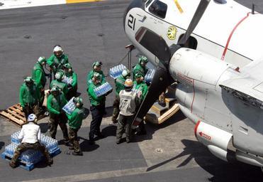 | Keywords: US Navy 080625-N-4005H-002 Sailors load cases of water bound for the Philippines onto a C-2A Greyhound assigned to the.jpg en PACIFIC OCEAN June 25 2008 Sailors load cases of water bound for the Philippines onto a C-2A Greyhound assigned to the Providers of Fleet Logistics Combat Support Squadron VRC 30 on the flight deck of the Nimitz-class aircraft carrier USS Ronald Reagan CVN 76 Ronald Reagan sent 12 000 bottles of water and 7 500 pounds of Rice to the Philippines supporting disaster relief efforts The Ronald Reagan Carrier Strike Group is support the government of the Republic of the Philippines to help provide humanitarian assistance and disaster relief to the victims of Typhoon Fengshen U S Navy photo by Mass Communication Specialist 3rd Class Aaron Holt Released 2008-06-25 080625-N-4005H-002 Navy http //www navy mil/view_image asp id 60590 U S Navy photo by Mass Communication Specialist 3rd Class Aaron Holt PD-USGov-Military-Navy USS Ronald Reagan CVN-76 humanitarian aid Grumman C-2 Greyhound Fleet Logistics Support Squadron 30 United States Navy Typhoon Fengshen 2008 Bottled water |