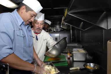 | Keywords: US Navy 080625-N-0841E-033 Former Top Chef contestant, Otto Borsich, lends a hand preparing a meal during a recent visit to the amphibious transport dock ship USS San Antonio (LPD 17).jpg en NORFOLK Va June 25 2008 Former Top Chef contestant Otto Borsich lends a hand preparing a meal during a recent visit to the amphibious transport dock ship USS San Antonio LPD 17 Borsich a former mess management specialist visited San Antonio's galley to offer advice and creative cooking ideas to the crew U S Navy photo by Mass Communication Specialist 2nd Class Oscar Espinoza Released 2008-06-25 080625-N-0841E-033 Navy http //www navy mil/view_image asp id 60724 U S Navy photo by Mass Communication Specialist 2nd Class Oscar Espinoza PD-USGov-Military-Navy Naval Station Norfolk Aboard USS San Antonio LPD 17 Top Chef |