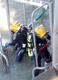 | Keywords: US Navy 080722-N-3446M-032 Senior Chief Navy Diver Paul Adams, assigned to Mobile Diving and Salvage Unit (MDSU) 1, and Indonesian Master Sgt. Santosa Efendy, are lowered into the water from the Military Sealift Command rescue.jpg en SURABAYA Indonesia July 22 2008 Senior Chief Navy Diver Paul Adams assigned to Mobile Diving and Salvage Unit MDSU 1 and Indonesian Master Sgt Santosa Efendy are lowered into the water from the Military Sealift Command rescue and salvage ship USNS Safeguard T-ARS 50 for a joint dive in Surabaya Harbor The diving exercise is part of a Naval Engagement Activity NEA between the United States and Indonesia The NEA is part of an annual series of bilateral maritime training exercises designed to build relationships and enhance the operational readiness of the participating forces between the U S and several Southeast Asian nations U S Navy photo by Mass Communication Specialist 1st Class Kim McLendon/Released 2008-07-22 080722-N-3446M-032 Navy http //www navy mil/view_image asp id 61877 U S Navy photo by Mass Communication Specialist 1st Class Kim McLendon PD-USGov-Military-Navy Images from US Navy location Surabaya Indonesia Aboard USNS Safeguard T-ARS-50 United States Navy Divers Mobile Diving and Salvage Unit 1 Diving stages Diving helmets |