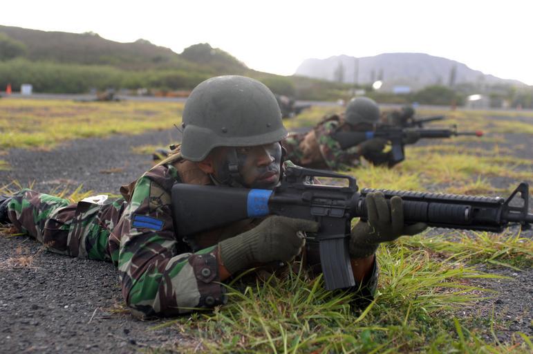 | Keywords: US Navy 080727-N-1974P-041 Indonesian marines launch an assault on an enemy stronghold.jpg en KANEOHE Hawaii July 27 2008 Indonesian marines assigned to 3rd Assault Amphibian Battalion working with U S Marines launch an assault on an enemy stronghold after performing an over the beach infiltration during Rim of the Pacific RIMPAC 2008 RIMPAC is the world's largest multinational exercise and is scheduled biennially by the U S Pacific Fleet Participants include the United States Australia Canada Chile Japan the Netherlands Peru Republic of Korea Singapore and the United Kingdom U S Navy photo by Mass Communication Specialist 2nd Class Walter Pels/Released 2008-07-27 080727-N-1974P-041 Navy http //www navy mil/view_image asp id 62005 U S Navy photo PD-USGov-Military-Navy Marine Corps Base Hawaii Republic of Indonesia Marine Corps Males with M16 rifle |