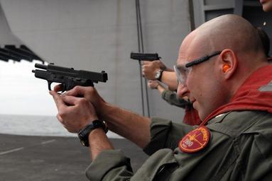 | Keywords: US Navy 080824-N-4005H-338 Cmdr. Trey Sisson, assigned to the.jpg en INDIAN OCEAN Aug 24 2008 Cmdr Trey Sisson assigned to the Eagles of Strike Fighter Squadron VFA 115 fires a 9 mm pistol at a target during a small-arms weapons qualifying exercise on aircraft elevator 4 aboard the Nimitz-class aircraft carrier USS Ronald Reagan CVN 76 The weapons exercise was used to teach Sailors proper gun handling techniques The Ronald Reagan Carrier Strike Group is on a routine deployment in the U S 7th Fleet area of responsibility U S Navy photo by Mass Communication Specialist 3rd Class Aaron Holt/Released 2008-08-24 080824-N-4005H-338 Navy http //www navy mil/view_image asp id 62986 U S Navy photo by Mass Communication Specialist 3rd Class Aaron Holt PD-USGov-Military-Navy Aircraft elevators of USS Ronald Reagan CVN-76 SIG Sauer P228 Pistol shooting Strike Fighter Squadron 115 United States Navy Firearms training on USS Ronald Reagan CVN-76 |