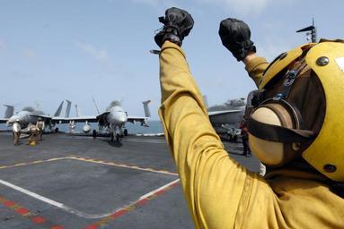 | Keywords: US Navy 080901-N-7730P-087 Aviation Boatswain's Mate (Handling) Airman Richard Garcia gives the pilot a hand signal.jpg en NORTH ARABIAN SEA Sept 1 2008 Aviation Boatswain's Mate Handling Airman Richard Garcia gives the pilot of an F/A-18 on the flight deck of the Nimitz-class aircraft carrier USS Ronald Reagan CVN 76 a hand signal prior to moving the aircraft across the deck and into the launch cycle Ronald Reagan is deployed to the U S 5th Fleet area of responsibility and is focused on reassuring regional partners of the United States' commitment to security which promotes stability and global prosperity U S Navy photo by Mass Communication Specialist 3rd Class Gary Prill/Released 2008-09-01 080901-N-7730P-087 Navy http //www navy mil/view_image asp id 63417 U S Navy photo by Mass Communication Specialist 3rd Class Gary Prill PD-USGov-Military-Navy Aviation Boatswain's Mates Handlers Aboard USS Ronald Reagan CVN-76 |