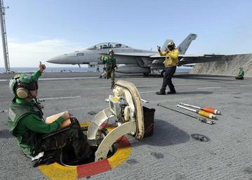 | Keywords: US Navy 080909-N-7241L-004 Flight deck personnel aboard the aircraft carrier USS Theodore Roosevelt (CVN 71) prepare to launch an F-A-18F Super Hornet strike fighter assigned to the.jpg en ATLANTIC OCEAN Sept 9 2008 Flight deck personnel aboard the aircraft carrier USS Theodore Roosevelt CVN 71 prepare to launch an F/A-18F Super Hornet strike fighter assigned to the Blacklions of Strike Fighter Squadron VFA 213 Roosevelt is deployed as the lead ship of the Theodore Roosevelt Carrier Strike Group supporting maritime security operations in the U S 5th and 6th Fleet areas of responsibility U S Navy photo by Mass Communication Specialist 2nd Class Nathan Laird Released 2008-09-09 080909-N-7241L-004 Navy http //www navy mil/view_image asp id 63781 U S Navy photo by Mass Communication Specialist 2nd Class Nathan Laird PD-USGov-Military-Navy F/A-18F Super Hornet on flight decks Strike Fighter Squadron 213 United States Navy USS Theodore Roosevelt CVN-71 flight deck Photographs by Nathan Laird |