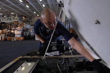 Keywords: US Navy 080917-N-3610L-224 Aviation Support Equipment Technician 3rd Charles Yeh reaches into a tractor to replace a damaged spark plug.jpg en GULF OF OMAN Sept 17 2008 Aviation Support Equipment Technician 3rd Charles Yeh reaches into a tractor to replace a damaged spark plug in the hangar bay of the Nimitz-class aircraft carrier USS Ronald Reagan CVN 76 Ronald Reagan is deployed in the U S 5th Fleet area of responsibility focusing on reassuring regional partners of the United States commitment to security which promotes stability and global prosperity U S Navy photo by Mass Communication Specialist 3rd Class Torrey W Lee/Released 2008-09-17 080917-N-3610L-224 Navy http //www navy mil/view_image asp id 64173 U S Navy photo by Mass Communication Specialist 3rd Class Torrey W Lee PD-USGov-Military-Navy Hangar bays of USS Ronald Reagan CVN-76 Aviation Support Equipment Technician