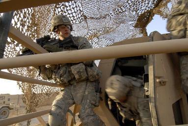 | Keywords: US Navy 080922-N-6278K-101 Army Pfc. Bob Ward participates in the Hummvee Egress Assistance Training as part of the Raider Bayonet training exercise.jpg en FOB FALCON Iraq Sept 22 2008 Army Pfc Bob Ward assigned to 3rd Platoon Delta Company attached to Echo Company 4th Infantry Division participates in the Hummvee Egress Assistance Training as part of the Raider Bayonet training exercise at Forward Operating Base Falcon U S Navy photo by Petty Officer 2nd Class Joan E Kretschmer/Released 2008-09-22 080922-N-6278K-101 Navy http //www navy mil/view_image asp id 64594 U S Navy photo by Petty Officer 2nd Class Joan E Kretschmer PD-USGov-Military-Navy Forward Operating Base Falcon Camouflage nettings |