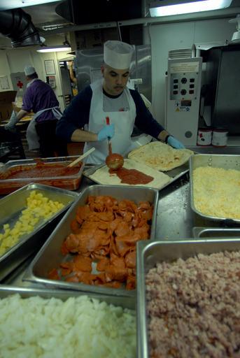 | Keywords: US Navy 080926-N-7730P-035 Operation Specialist 2nd Class Marvyn Moreno makes pizzas for a.jpg en GULF OF OMAN Sept 26 2008 Operation Specialist 2nd Class Marvyn Moreno makes pizzas for a Pizza Night aboard the Nimitz-class aircraft carrier USS Ronald Reagan CVN 76 Pizza Night and Ice Cream Socials are a way for the Supply Department to give something special to the crew and to break the daily monotony of shipboard life Ronald Reagan is deployed to the U S 5th Fleet area of responsibility U S Navy photo by Mass Communication Specialist 3rd Class Gary Prill/Released 2008-09-26 080926-N-7730P-035 Navy http //www navy mil/view_image asp id 64681 U S Navy photo by Mass Communication Specialist 3rd Class Gary Prill PD-USGov-Military-Navy Food preparation aboard USS Ronald Reagan CVN-76 Pizza baking |