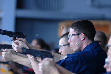 | Keywords: US Navy 081113-N-9132C-280 Aircrew Survival Equipmentman 3rd Class Robert Parker fires a 9mm pistol during live fire exercise aboard the Nimitz-class aircraft carrier USS Ronald Reagan (CVN 76).jpg en PACIFIC OCEAN Nov 13 2008 Aircrew Survival Equipmentman 3rd Class Robert Parker fires a 9mm pistol during live fire exercise aboard the Nimitz-class aircraft carrier USS Ronald Reagan CVN 76 Sailors participated in this exercise to renew qualifications for the 9mm pistol The Ronald Reagan Carrier Strike Group is on a scheduled deployment in the U S 7th Fleet area of responsibility U S Navy photo by Mass Communication Specialist Seaman Apprentice Oliver Cole/Released 2008-11-13 081113-N-9132C-280 Navy http //www navy mil/view_image asp id 66448 U S Navy photo by Mass Communication Specialist Seaman Apprentice Oliver Cole PD-USGov-Military-Navy Aircrew Survival Equipmentman Firearms training on USS Ronald Reagan CVN-76 Weapon training M9 pistol cartridge ejections Pistol shooting |
