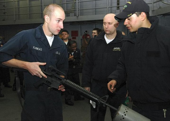 | Keywords: US Navy 090127-N-9134V-040 Gunner's Mate Seaman James Clarke monitors Seaman Jason Farkas as he clears the barrel of an M16 rifle during a weapons safety stand down.jpg en PERSIAN GULF Jan 27 2009 Gunner's Mate Seaman James Clarke right monitors Seaman Jason Farkas as he clears the barrel of an M16 rifle during a weapons safety stand down aboard the amphibious dock landing ship USS Carter Hall LSD 50 Carter Hall is deployed as part of the Iwo Jima Expeditionary Strike Group supporting maritime security operations in the U S 5th Fleet area of responsibility U S Navy photo by Mass Communication Specialist 2nd Class Flordeliz Valerio/Released 2009-01-27 090127-N-9134V-040 Navy http //www navy mil/view_image asp id 68400 U S Navy photo by Mass Communication Specialist 2nd Class Flordeliz Valerio PD-USGov-Military-Navy Aboard USS Carter Hall LSD-50 Males with M16 rifle Firearm safety Gunner's Mate |