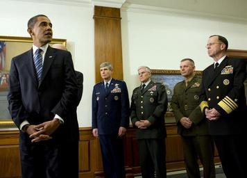 | Keywords: US Navy 090128-N-0696M-200 President Barack Obama addresses the media during his first visit to the Pentagon since becoming commander-in-chief.jpg en WASHINGTON Jan 28 2009 President Barack Obama with from left Gen Norton Schwartz Air Force chief of staff; Gen George W Casey U S Army chief of staff; Gen James E Cartwright vice chairman of the Joint Chiefs of Staff and Adm Mike Mullen chairman of the Joint Chiefs of Staff addresses the media during his first visit to the Pentagon since becoming commander-in-chief Obama and Vice President Joe Biden met with Secretary of Defense Robert M Gates and all the service chiefs for their input on the way ahead in Afghanistan and Iraq U S Navy photo by Mass Communication Specialist 1st Class Chad J McNeeley/Released 2009-01-28 090128-N-0696M-200 Navy http //www navy mil/view_image asp id 68411 U S Navy photo by Mass Communication Specialist 1st Class Chad J McNeeley 150px PD-USGov-Military-Navy Barack Obama in 2009 Interior of The Pentagon Michael G Mullen in 2009 Norton A Schwartz George W Casey Jr in 2009 James E Cartwright Barack Obama with military people |