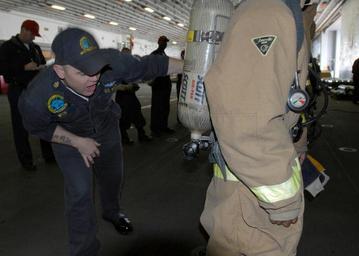 | Keywords: US Navy 090205-N-0979M-033 Chief Damage Controlman Gary Wise onducts an equipment check on Sailors during a general quarters drill.jpg en SAN DIEGO Feb 5 2009 Chief Damage Controlman Gary Wise assigned to Afloat Training Group ATG conducts an equipment check on Sailors during a general quarters drill in the hangar bay aboard the amphibious assault ship USS Peleliu LHA 5 ATG is assessing a mobility and damage control MOB-D assessment aboard Peleliu before the ship goes into the shipyard U S Navy photo by Mass Communication Specialist 2nd Class Leonard J Mandap/Released 2009-02-05 090205-N-0979M-033 Navy http //www navy mil/view_image asp id 68676 U S Navy photo by Mass Communication Specialist 2nd Class Leonard J Mandap PD-USGov-Military-Navy Damage Controlman United States Navy training Aboard USS Peleliu LHA-5 |
