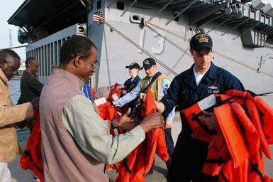 | Keywords: US Navy 090206-N-1655H-705 Sailors assigned to the amphibious transport dock USS Nashville (LPD 13) pass out life vests to Senegalese marine biologists before boarding a rigid hull inflatable boat.jpg en DAKAR Senegal Feb 6 2009 Sailors assigned to the amphibious transport dock USS Nashville LPD 13 pass out life vests to Senegalese marine biologists before boarding a rigid hull inflatable boat Africa Partnership Station and the National Oceanic and Atmospheric Administration are working with local marine biologists Nashville is deployed as a part of Africa Partnership Station an international initiative developed by Naval Forces Europe and Naval Forces Africa which aims to work cooperatively with U S and international partners to improve maritime safety and security in Africa U S Navy photo by Mass Communication Specialist 2nd Class David Holmes/Released 2009-02-06 090206-N-1655H-705 Navy http //www navy mil/view_image asp id 68648 U S Navy photo by Mass Communication Specialist 2nd Class David Holmes PD-USGov-Military-Navy United States Navy in Dakar Aboard USS Nashville LPD-13 Africa Partnership Station 2009 |